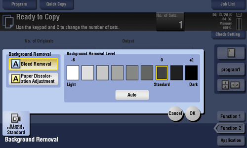 [Background Removal Level] | Adjust the density of the background color for originals with colored background. If [Auto] is selected, the density of the background color is determined automatically, and the original is copied at the optimal background density level. |