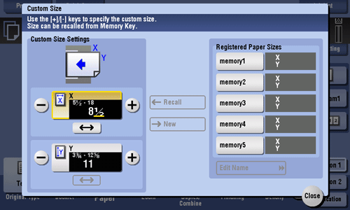 After you have entered the size, select a key ([memory1] to [memory5]) in [Registered Paper Sizes], and tap [New]. Then the size you have entered is registered in the memory. You can recall the registered size in the future.