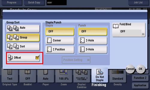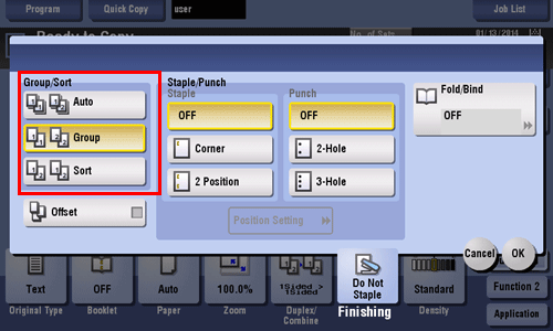 [Auto] | Automatically switches Group and Sort depending on the number of sheets of the loaded original and the number of copies. If you load originals of multiple pages and specify multiple copies, the mode is automatically switched to Sort in order to process output. If other conditions are set, output processing is carried out in Group mode. |