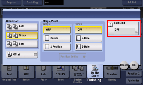 [Fold/Bind] | Staples copy outputs in the center the paper or fold them in the center before discharging.
