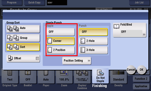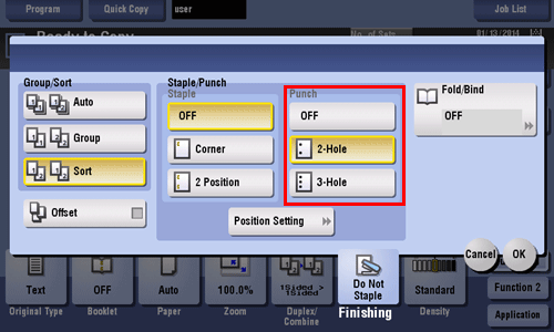 [Position Setting] | Select the punch position and original loading direction. If [Auto] is specified for the punch position, the punch position is determined automatically based on the direction of the loaded original. |