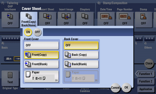 [ON]/[OFF] | Select [ON] to specify Cover Sheet. |