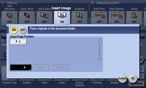 [Insert Page Position] | Specify a page number you want to insert a sheet into. The original is inserted after the page you have specified.