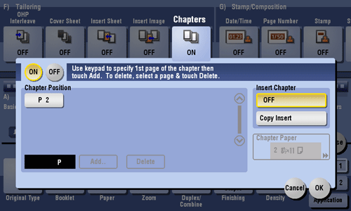 [Chapter Paper] | If [Insert Chapter] is set to [Copy Insert], select the paper tray where the Chapter Paper is stacked. If the chapter paper and text paper differ, use the same size of paper and stack them in the correct direction. |