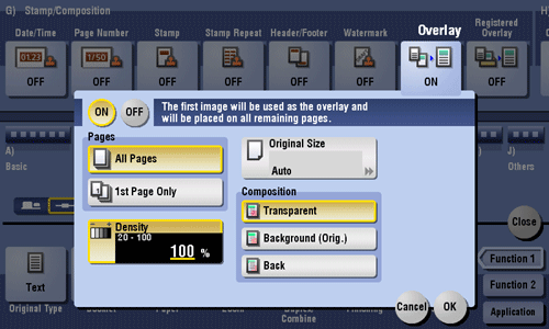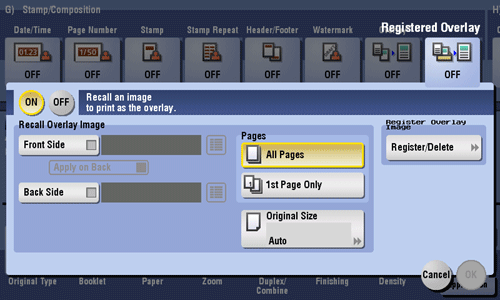 [Recall Overlay Image] | Specify which side of the paper to compose the overlay image, and select an overlay image to be composed. Check the density, composition method, and preview of overlay image if necessary. If you set [Apply on Back], the image on the front side is composed on the back side of paper. |