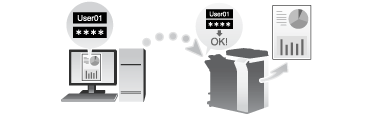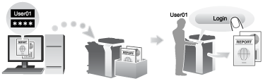 Since you need to be authenticated in this machine to print the data saved in the box, this function is suitable for safely printing highly confidential documents. When you are successfully authenticated, the print data of the login user is automatically printed. This enhances security as well as ensures smooth operation.