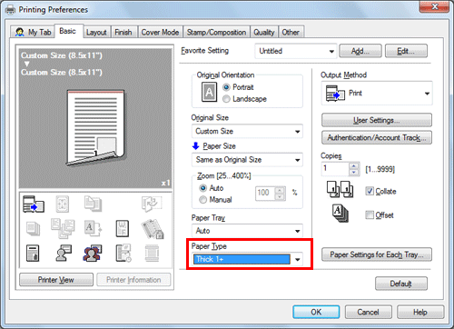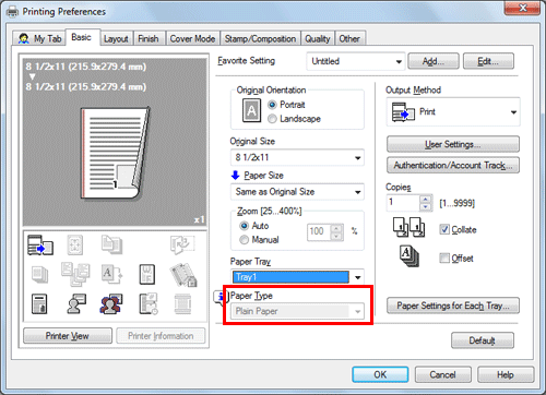 In [Paper Type] in the [Basic] tab, select the type of paper for printing. This function is enabled when [Paper Tray] is set to [Auto].