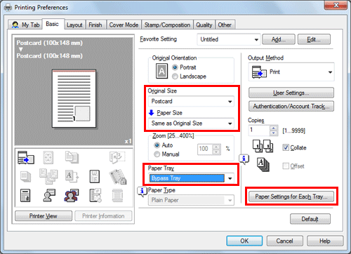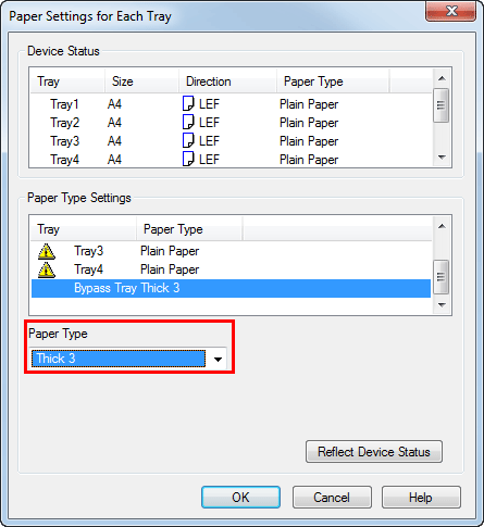 In [Paper Settings for Each Tray...] on the [Basic] tab, you can set a paper type for each tray. When you specify anything other than [Auto] in [Paper Tray], the paper type information specified here is applied.