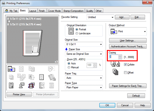 In [Copies] in the [Basic] tab, specify the number of copies you want to print.