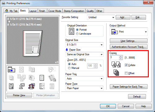 When the [Collate] check box on the [Basic] tab is selected, copies are output separately in a set-by-set manner, for example, "Pages 1, 2, 3, 4, and 5", "Pages 1, 2, 3, 4, and 5", and then "Pages 1, 2, 3, 4, and 5". When the [Offset] check box is selected, the sets are output in staggered layers.