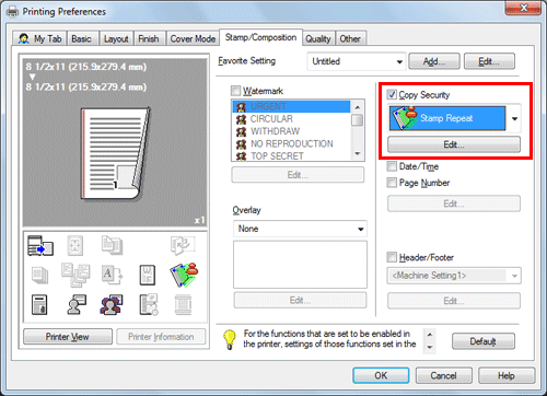 On the [Stamp/Composition] tab, select the [Copy Security] check box, and then select [Stamp Repeat].