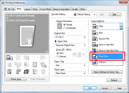 In [Output Method] in the [Basic] tab, select [Proof Print].
