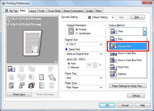 In [Output Method] on the [Basic] tab, select [Secure Print].