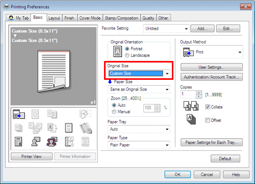 In [Paper Size] in the [Basic] tab, select the size of paper for printing. The zoom ratio is automatically determined by the paper sizes selected in [Original Size] and [Paper Size].