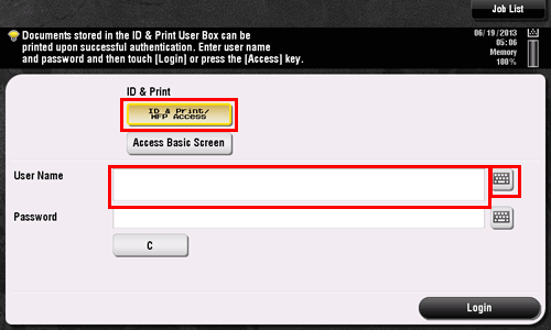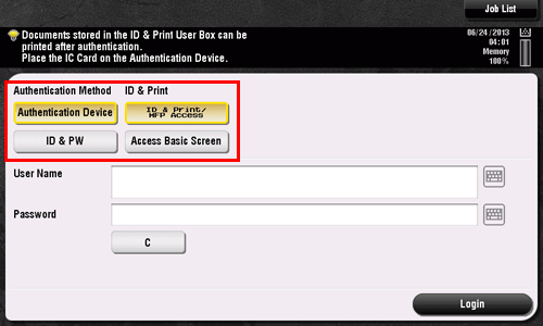 When you select [Access Basic Screen] in [ID & Print], you can log in without starting printing.