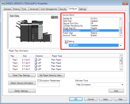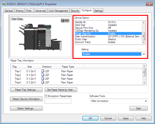 In [Device Option] in the [Configure] tab, check that the [User Authentication] and [Single Sign-On] settings are correctly configured for your operating environment.
