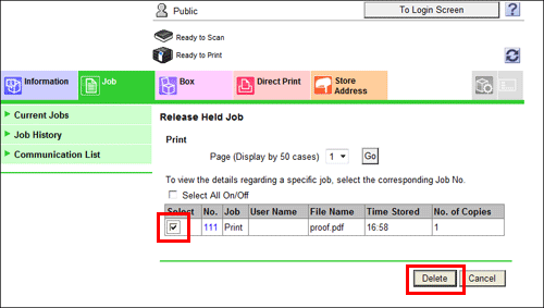 A job, which has been sent to this machine with [Proof Print] enabled, can be deleted remotely using Web Connection via the Web browser of the computer.
