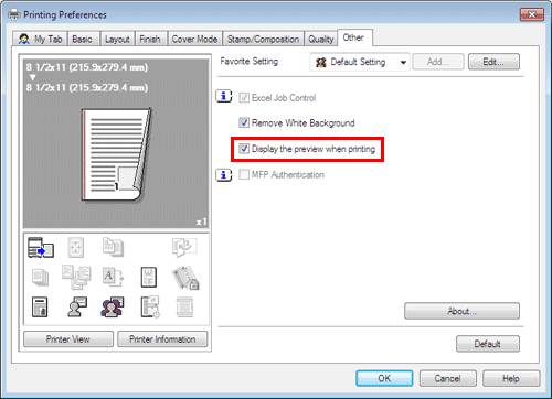 In the [Other] tab, select the [Display the preview when printing] check box.