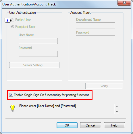 Check [Enable Single Sign-On functionality for printing functions] box, and click [OK].