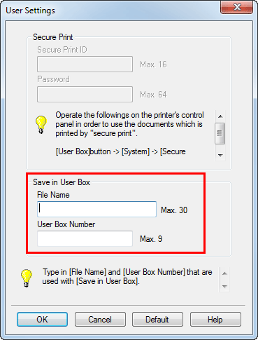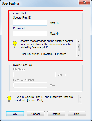 Data printed using the Secure Print function is saved in the Secure Print User Box. To print the saved data, you need to enter the ID and password specified in the printer driver.