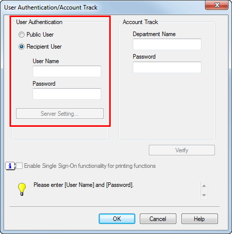 If the quick authentication for printing server is installed, you can start printing by authentication with only the user name but without password entry. How to configure the setting is explained using Web Connection. For details, refer to Here.