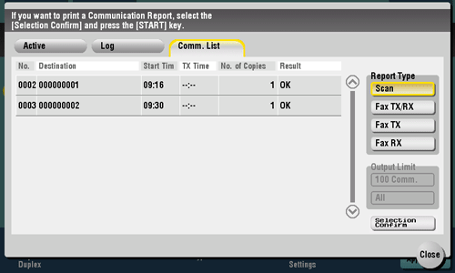 Tap [Comm. List] to print a fax report that contains the results of Scan, Fax TX, Fax RX, and fax communication (TX/RX) jobs. For a fax report, you can specify the number of destinations.