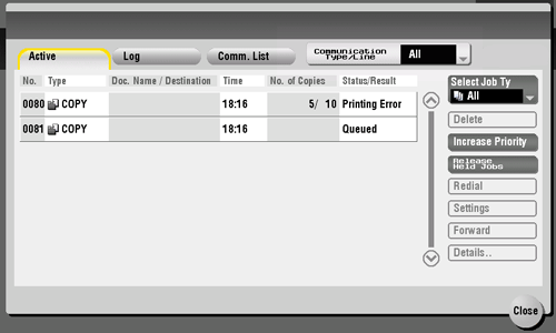 Tap [Log] to display a list of jobs processed on this machine up till then. You can check a job that could not be ended due to an error.