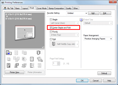 In the [Finish] tab, select the [Center Staple and Fold] check box.