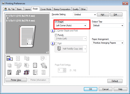 In the [Finish] tab, select the [Staple] check box. In addition, specify the number and positions of staples.