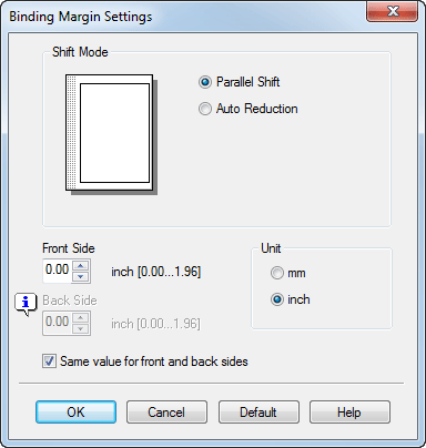 [Front Side]/[Back Side] | Specify the size of the margin on the front side. When you print on both sides, specify the size of the margin on the back side. When the [Same value for front and back sides] check box is selected, a margin of the same size is created on both front and back sides. |