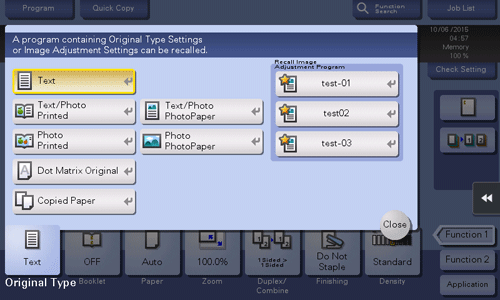 [Recall Image Adjustment Program] | Call the image quality adjustment program. The registered content of a program is applied. For image adjustment program, you can register the settings of [Original Type], [Density], [Bkgd. Removal], [Text Enhancement], [Neg-/Pos. Reverse], [Image Adjustment], and [Mirror Image]. For details on how to register, refer to Here. |