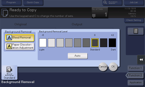 [Background Removal Level] | Adjust the density of the background color for originals with colored background. If [Auto] is selected, the density of the background color is determined automatically, and the original is copied at the optimal background density level. |