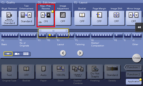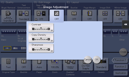 [Recall Image Adjustment Program] | Call the image quality adjustment program. The registered content of a program is applied. For image adjustment program, you can register the settings of [Original Type], [Density], [Bkgd. Removal], [Text Enhancement], [Neg-/Pos. Reverse], [Image Adjustment], and [Mirror Image]. For details on how to register, refer to Here. |