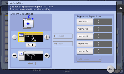 [Custom Size Settings] | For the inch area, tap [+]/[-] or the keypad to enter the length (X) and width (Y) of the paper. After you have entered the size, select a key ([memory1] to [memory5]) in [Registered Paper Sizes], and tap [New]. Then the size you have entered is registered in the memory. You can recall the registered size in the future. |