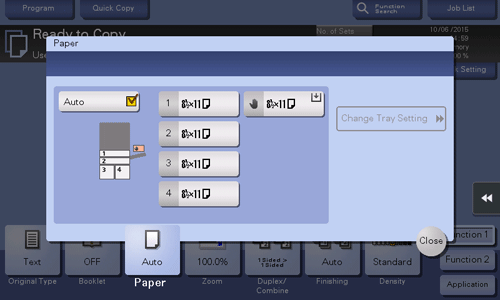 [1] - [4] | Tap this button to specify paper loaded into any of Tray1 to Tray4 to make a copy. |