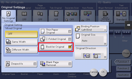 [Non-Image Area Erase] | If you select Book Original, this item is set automatically. When making copies with the ADF open and the original placed on the Original Glass, the machine detects the outline of the original and erases shadows outside the original. Cancel the setting if necessary. |
