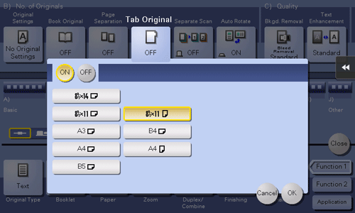 [ON]/[OFF] | Select [ON] to copy an index original. Also select the size of the index original. |