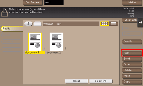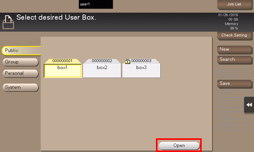 This example uses the Public User Box for explanatory purposes. To use a Personal User Box or a Group User Box, tap [Personal] or [Group] and select the desired box.