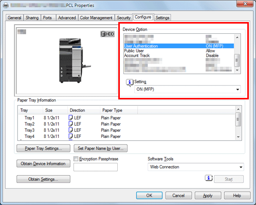 In [Device Option] in the [Configure] tab, check that the User Authentication/Account Track setting is correctly configured for your operating environment.