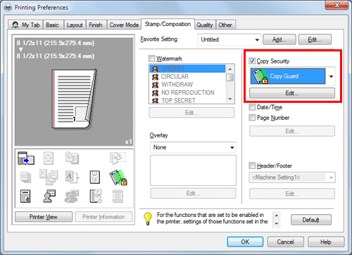 On the [Stamp/Composition] tab, select the [Copy Security] check box, and then select [Copy Guard].