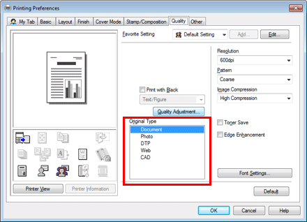In [Paper Type] in the [Basic] tab, select the type of paper for printing. This function is enabled when [Paper Tray] is set to [Auto].