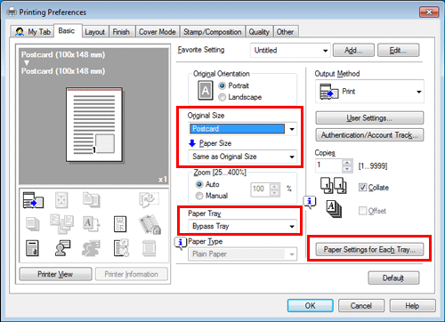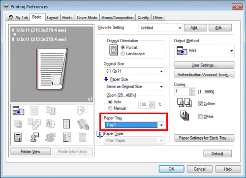 In [Paper Settings for Each Tray...] on the [Basic] tab, you can set a paper type for each tray. When you specify anything other than [Auto] in [Paper Tray], the paper type information specified here is applied.
