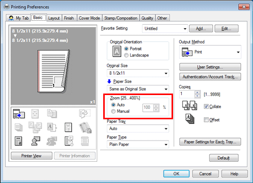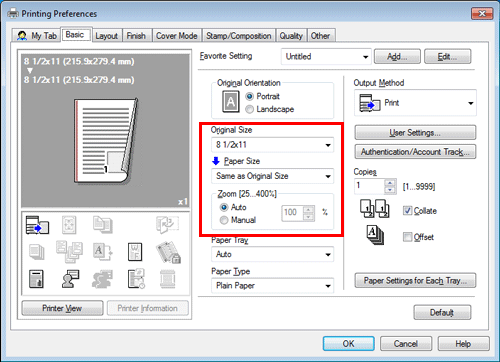 In [Paper Size] in the [Basic] tab, select the size of paper for printing. The zoom ratio is automatically determined by the paper sizes selected in [Original Size] and [Paper Size].
