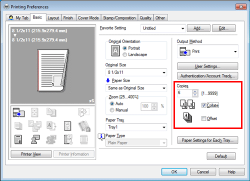 When the [Collate] check box on the [Basic] tab is selected, copies are output separately in a set-by-set manner, for example, "Pages 1, 2, 3, 4, and 5", "Pages 1, 2, 3, 4, and 5", and then "Pages 1, 2, 3, 4, and 5". When the [Offset] check box is selected, the sets are output in staggered layers.