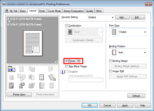 In the [Layout] tab, select the [Rotate 180] check box.