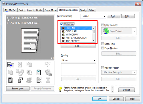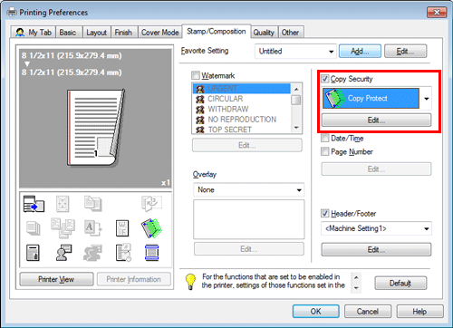 On the [Stamp/Composition] tab, select the [Copy Security] check box, and then select [Copy Protect].
