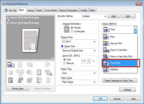 In [Output Method] in the [Basic] tab, select [Proof Print].