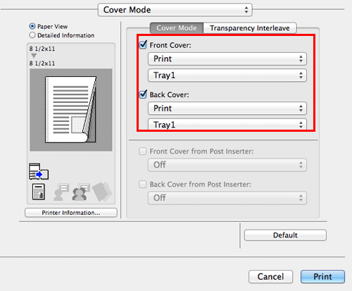 In [Cover Mode], select the [Front Cover from Post Inserter:] and [Back Cover from Post Inserter:] check boxes.