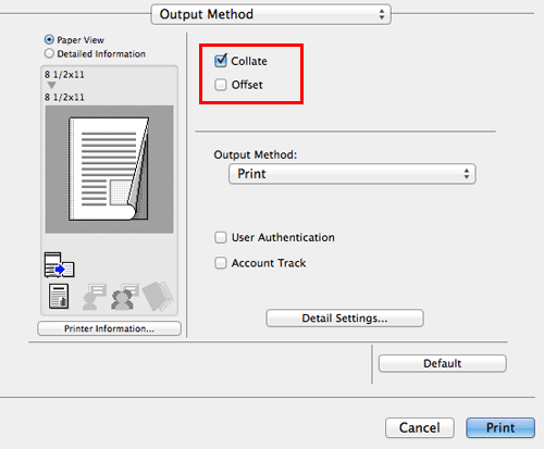 When the [Collate] check box in [Output Method] is selected, copies are output in a set-by-set manner, for example, "Pages 1, 2, 3, 4, and 5", "Pages 1, 2, 3, 4, and 5", and then "Pages 1, 2, 3, 4, and 5". When the [Offset] check box is selected, the sets are output in staggered layers.