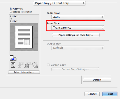 In [Paper Type:] in [Paper Tray / Output Tray], select [Transparency].